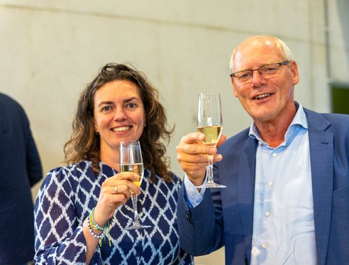 Het hogeschooljaar is geopend. In Leeuwarden door Anneke Luijten, samen met melkveehouder en oud-student Pieter van der Valk.