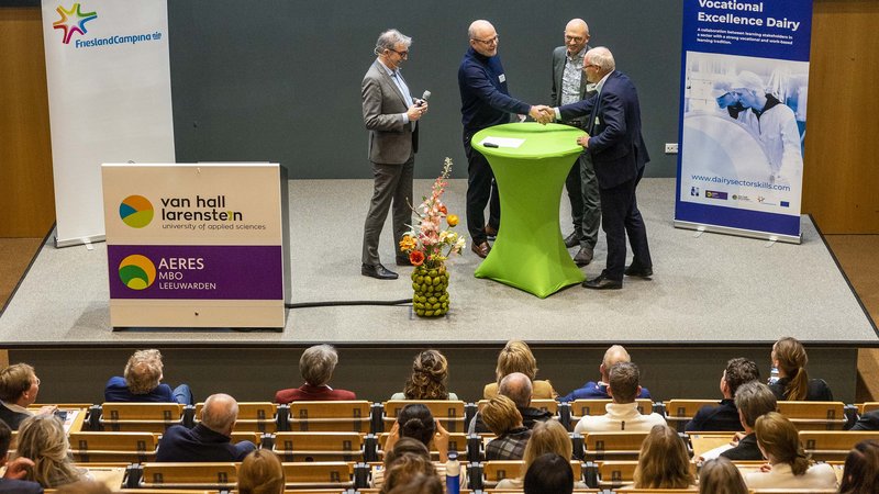 Tijdens een speciale kick-off bijeenkomst op 9 maart hebben Aeres MBO Leeuwarden, Hogeschool Van Hall Larenstein en FrieslandCampina de handen ineen geslagen voor het nieuwe ‘Centre of Vocational Excellence Dairy’ in Leeuwarden. Met vernieuwde onderwijsvormen, delen van kennis en onderzoek en een intensieve samenwerking tussen onderwijs en industrie gaat dit ‘CoVE Dairy’ een nieuwe generatie zuivelprofessionals toekomstgericht opleiden.