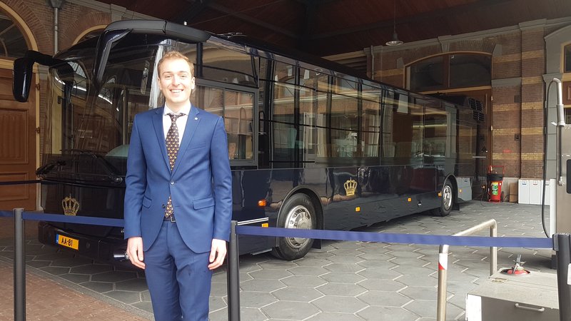 Gisterochtend, de dag vóór de 56e verjaardag van Willem-Alexander, hees de student zich in een donkerkleurig pak. Afgemaakt met de stropdas van zijn opa. “Extra symbolisch en de cirkel is nu rond”, vertelt Marc, “want in de kledingwinkel van mijn opa en oma kwamen vroeger medewerkers van het Koninklijk Huis.” In die outfit begaf hij zich naar de koninklijke stallen van Huis ten Bosch. Om vervolgens met de bus naar het paleis te reizen, en daar een aperitief in de balzaal, een lunch in de Oranjezaal en een groepsfoto op het bordes mee te maken.