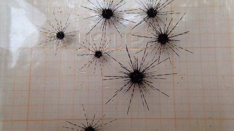 Afbeelding: Diadema zee-egel kolonisten gekweekt in het Diadema I project. Foto: Tom Wijers.