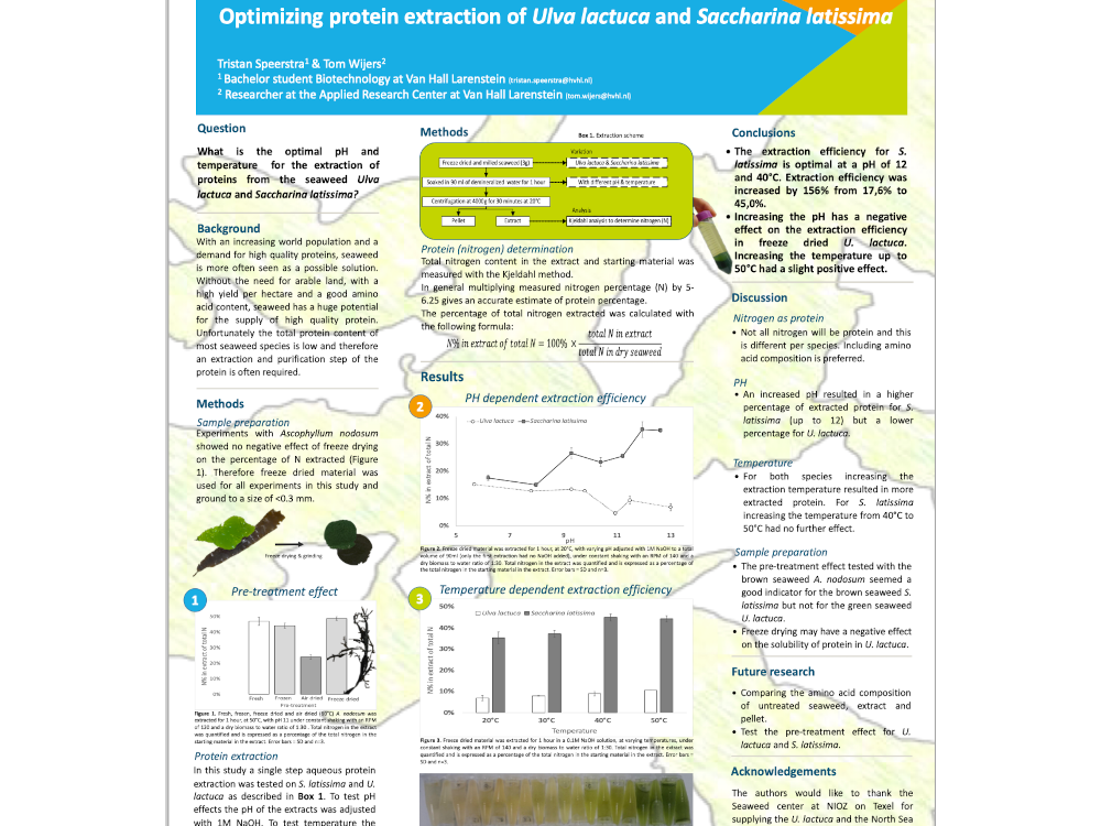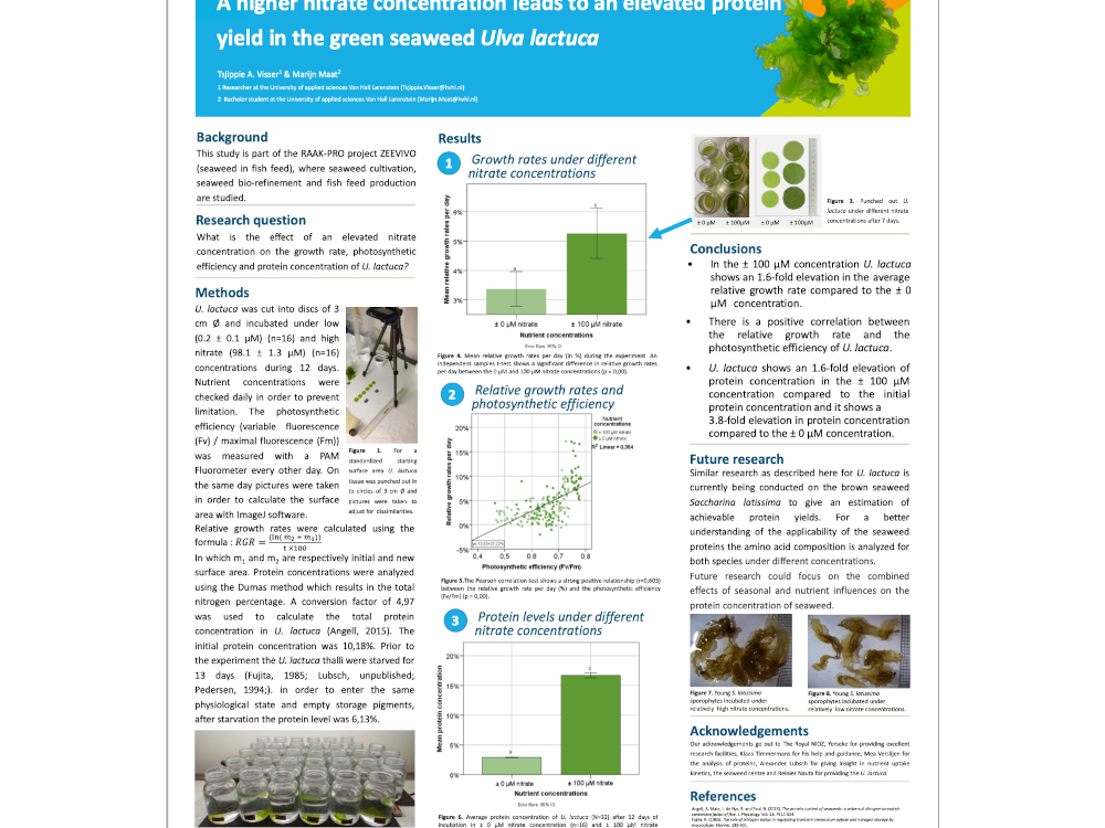 Als eerste wordt gekeken naar het effect van stikstofbron en –concentratie op de groeisnelheid en het eiwitgehalte van de zeewiersoorten Saccharina latissima (suikerkelp) en Ulva lactuca (zeesla). Daarna wordt onderzocht hoe het zeewier optimaal verwerkt kan worden.